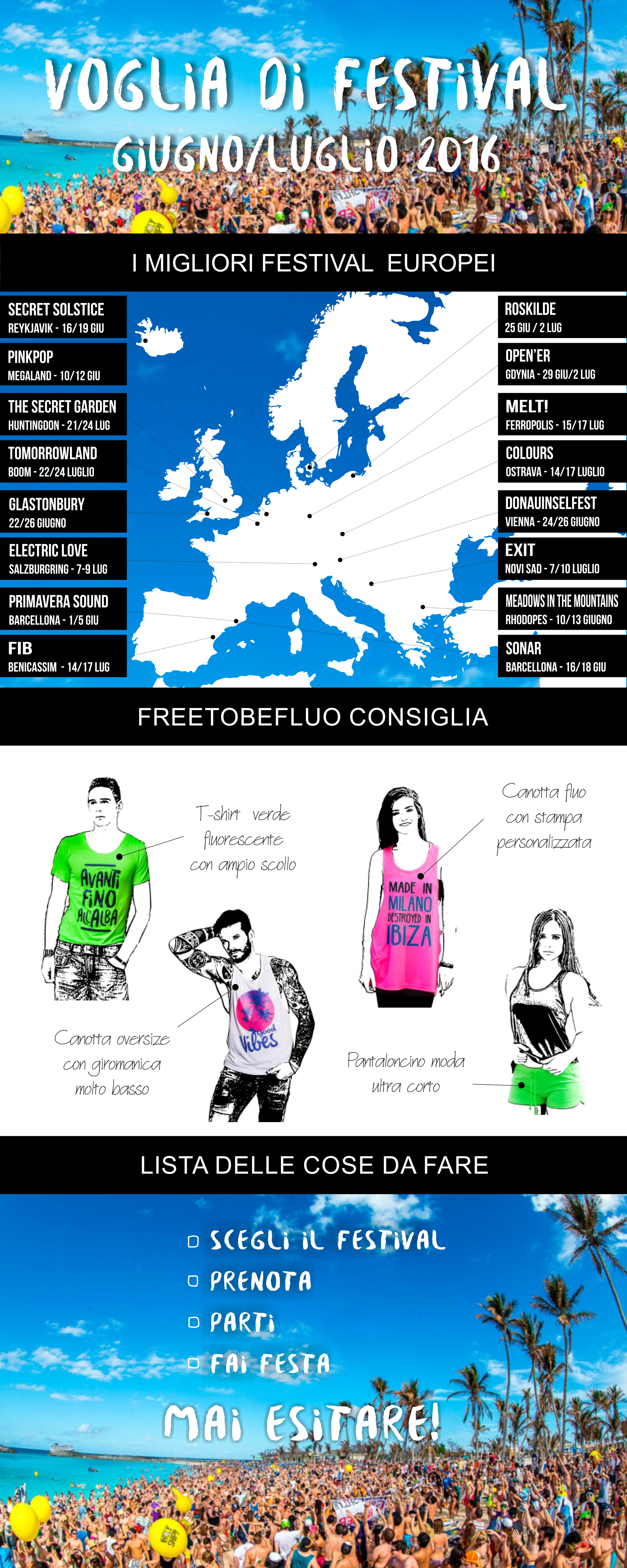 Se ti piace viaggiare e adori la musica, i festival sono l'occasione perfetta per unire queste due passioni. Per aiutarti a districarti fra i vari eventi che si svolgono in Europa, abbiamo preparato una mappa attraverso i migliori festival tra giugno e luglio 2016 in cui sfoggiare le nostre magliette e canotte fluo.